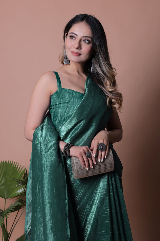 Elegant Emerald Green Tissue Silk Crunchy Party Wear Saree