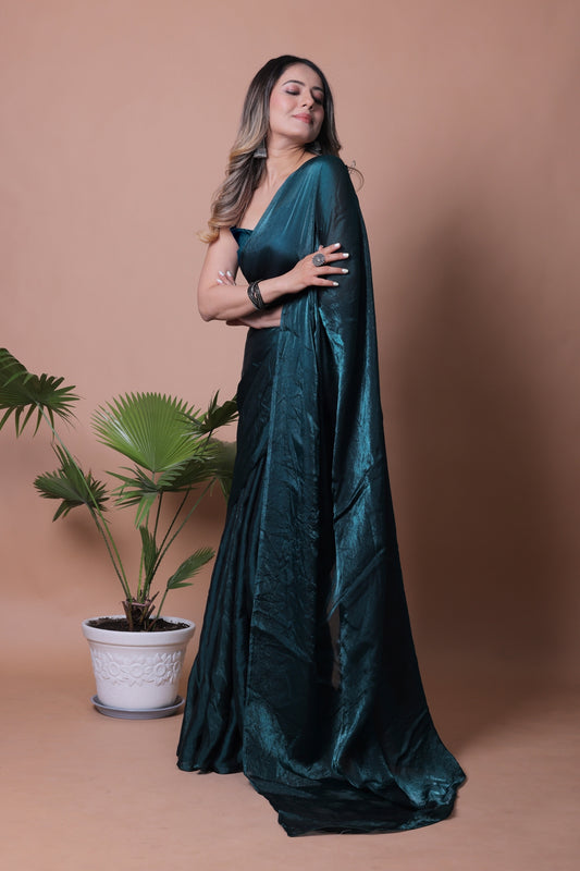 Elegant Dark Forest Green Shimmer Pure Satin Silk Two Tone Party Wear Saree