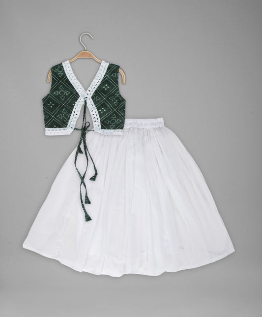 Bandhani Printed Western Green White Lehenga Choli With Fumki Lace