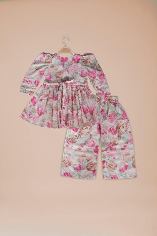 Alia Cut Style Open Front Floral Printed Kurti Palazzo Pant Set With Lace
