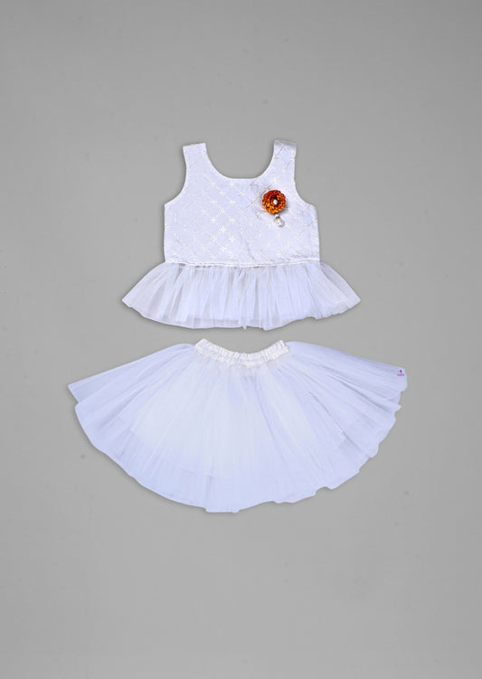 Baby Girl White Embroidery Top With Frell and Knee Lenght Skirt Clothing Set