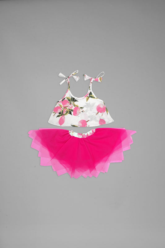 Baby Girls Floral Printed Crop Top And Square Net Cutout Pink Skirt Clothing Set