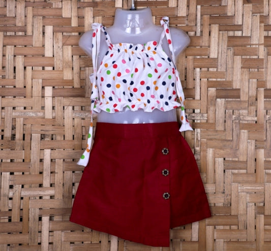 Baby Girls Polka Printed Crop Top And Knee Lenght Skirts With Button
