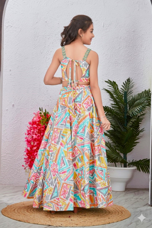 Girls Strappy Deap Neck Flower Printed Crop Top And Ruffle Style Lehenga Choli