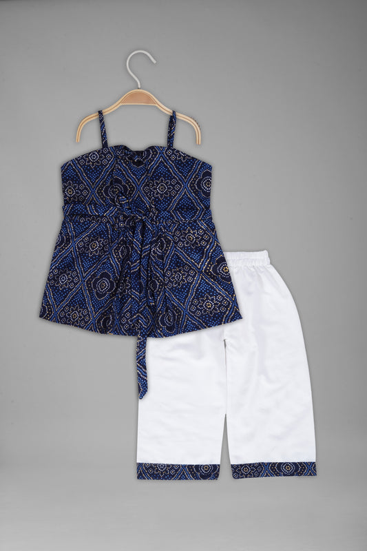 Girls Bandhani Printed Shoulder Strap Side Cut Kurti And Palazzo Pant Set