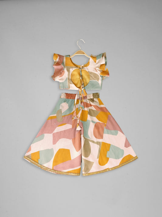Girls Abstract Printed Crop Top And Palazzo Set With Bottom Lace