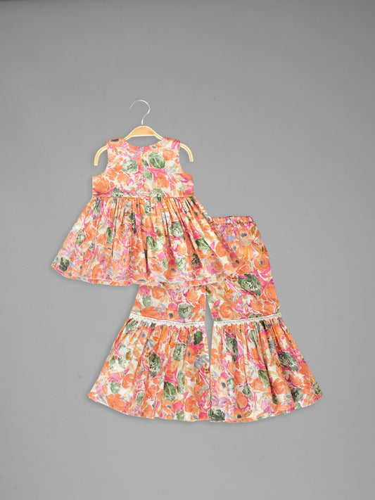 Girls Tassels Enhanced Multicolour Printed Alia Cut Kurti and Sharara with Scalloped Lace Detail